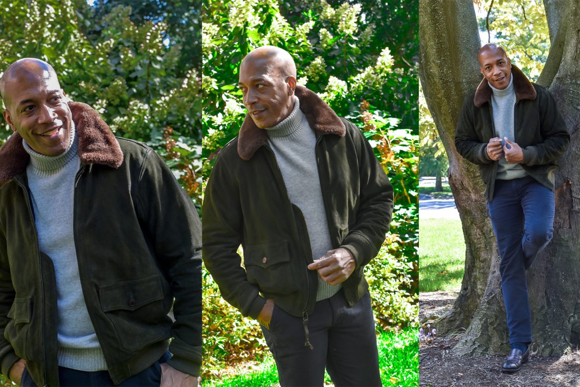 Bomber jacket – Polo Ralph Lauren | Turtleneck sweater – Peter Millar |Moleskin pants – Barbour | Loafers – Tom Ford (similar – Santoni) All pieces were found at Saks Fifth Avenue.