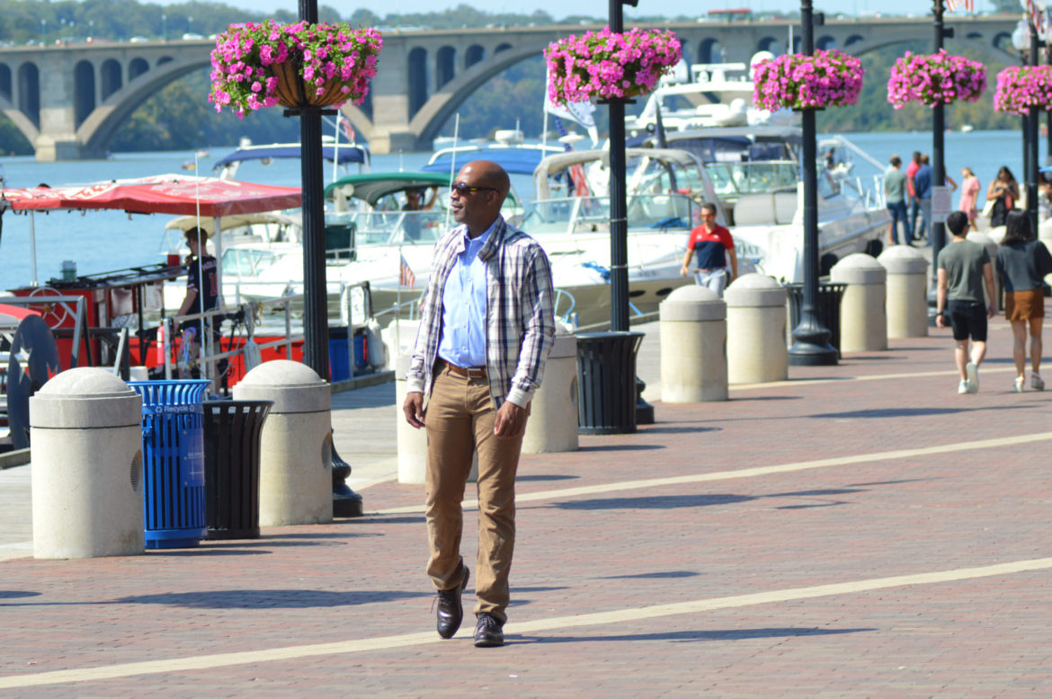 For a more casual style, I lost the suit jacket and tie and went with a simple dress shirt and added a fun plaid bomber jacket. It was a great look to stroll the Washington Harbor down in Georgetown.