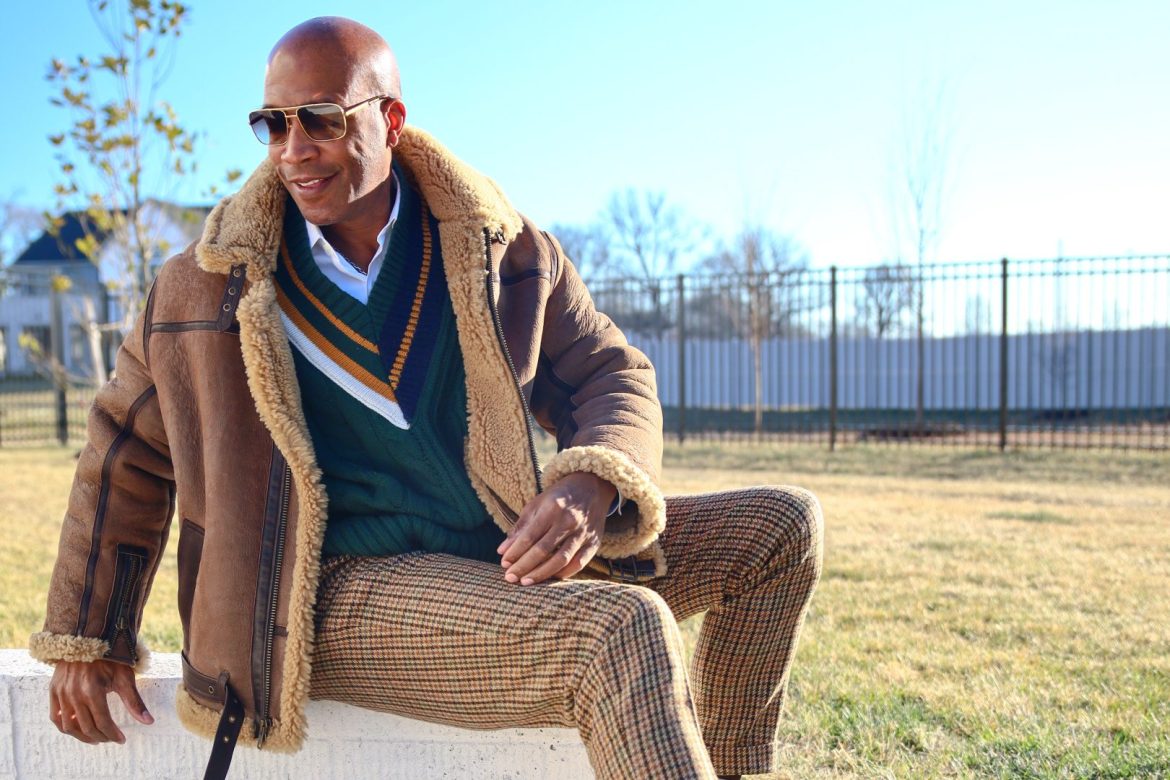Cotton-Cashmere Dress Shirt | BR ATHLETICS Varsity Sweater | Derby Suit Pant | Heritage Shearling Flight Jacket all by Banana Republic | Sunglasses – Louis Vuitton | Shoes – Gucci